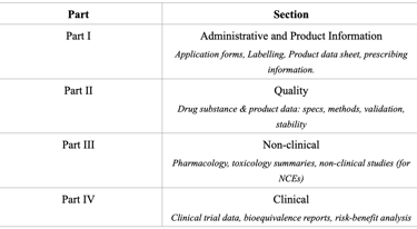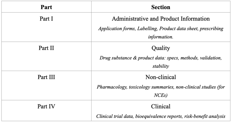 Malaysia adopts the ICH CTD/ASEAN Common Technical Dossier (ACTD) format for drug registration. The dossier consists of four parts, each covering a specific set of data.