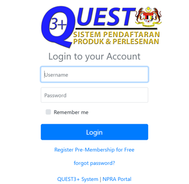 To conduct transactions for product registration, variation, licensing, renewal and other related transactions, you must register your full membership and purchase your digital certificate in the form of USB token. Once you have obtained and installed your digital certificate, you will be able to conduct your transactions in QUEST 3+.